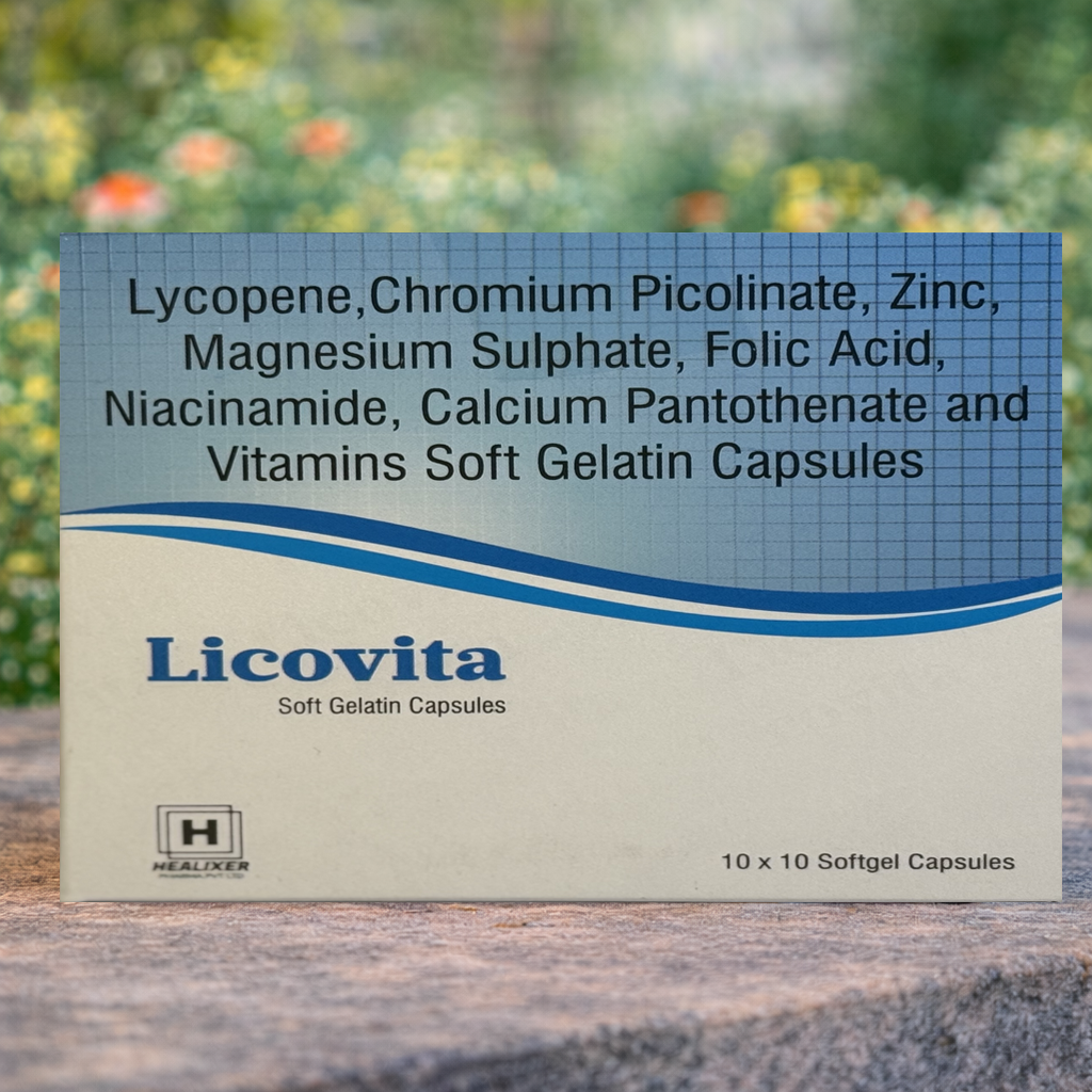 Lycopene 10 % 5000 mcg +Vitamin A ) IP 5000 IU+Vitamin B1 IP 10 mg+Vitamin B2 IP 10 mg+Zinc Sulphate Monohydrate IP 15 mg+Magnesium Sulphate IP 1.4 mg+Vitamin E IP 15 IU+Vitamin B6 IP 3 mg+Folic Acid IP 1000 mcg+ Vitamin B12 IP 5 mcg+Vitamin D3 IP 500 IU+Vitamin C IP 75 mg+